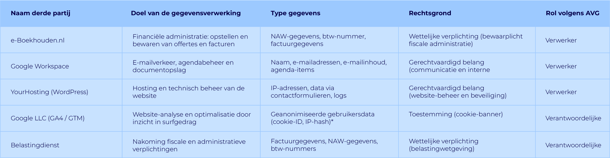 Wij delen persoonsgegevens alleen met derden wanneer dit noodzakelijk is voor onze dienstverlening of om te voldoen aan wettelijke verplichtingen. Hieronder vind je een overzicht van de belangrijkste derde partijen waarmee wij gegevens delen, hun rol onder de AVG, en het doel van de gegevensverwerking.